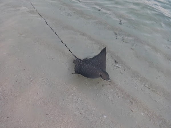 Nad brzegiem można też spotkać płaszczkę. Jedna wybrała się na spacer razem ze mną. Zajęta fotografowaniem krabów, kompletnie nie zwracałam uwagi na to, co dzieje się w wodzie. Aż tu nagle odwracam głowę i widzę jakiś kawał ciemnej płachty unoszący się przy brzegu. Przyglądam się i przyglądam i widzę, że płachta ma pyszczek, długi cienki ogonek, a pod spodem jest zupełnie biała. Podchodzę bliżej, płachta też się przybliża i teraz widzę już wyraźnie… to mała płaszczka sunąca sobie wzdłuż brzegu. Płynęła koło mnie aż do cypelka.