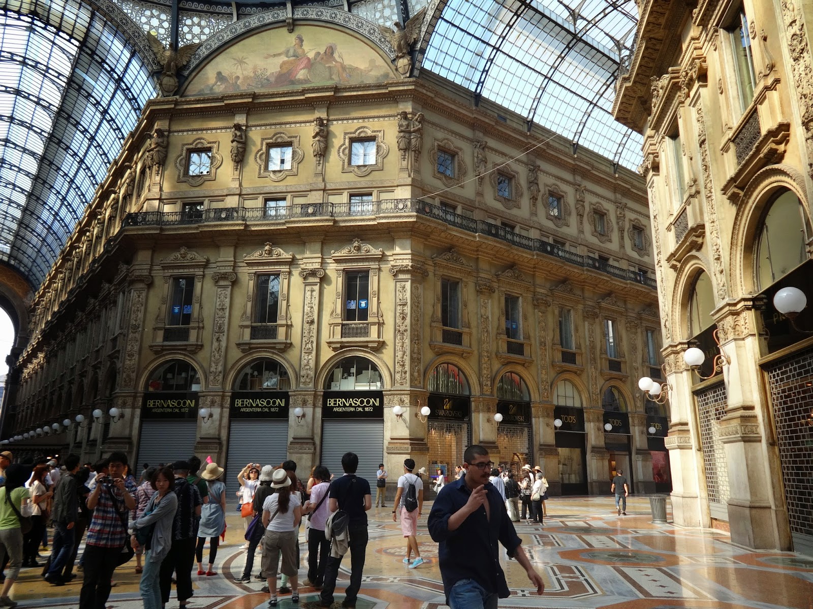 Via Manzoni dochodzę do miejsca znanego mi z przewodników i zdjęć. Tak, to Galeria Wiktora Emmanuela, która znajduje się przy Piazza del Duomo, głównym placu Starego Miasta. To najsłynniejsza w całych Włoszech galeria handlowa. To tutaj znajdziemy luksusowe włoskie marki ze świata mody, takie jak Prada, Armani czy Versace. I rzeczywiście okna wystaw sklepowych mówią same za siebie. Ja jednak skupiam się na podłodze, gdzie wypatruję umieszczonej w posadzce mozaiki przedstawiającej byka. Związany jest z nią przesąd, a mianowicie każdy, kto na pięcie obkręci się wokół własnej osi w punkcie wyznaczającym środek mozaiki powróci jeszcze do Mediolanu. Próbuję i ja, jest! Zatem, to nie ostatnia moja wizyta w tym mieście:)
