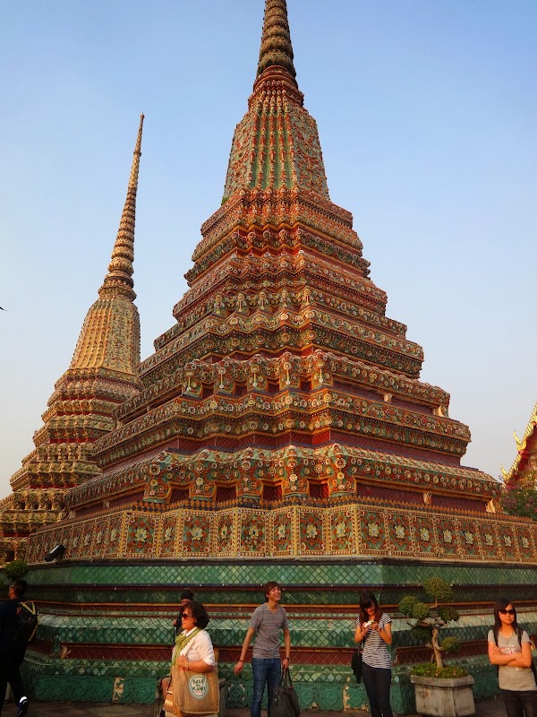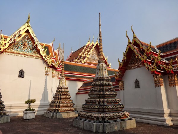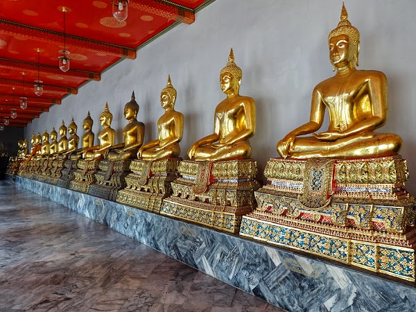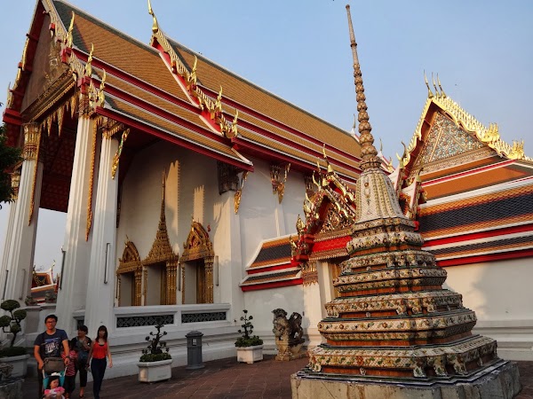 Wat Po to nie tylko Świątynia Leżącego Buddy, ale także cały kompleks budynków świątynnych, zachwycających blaskiem złota i misternymi ozdobami. Uwagę zwracają liczne wielobarwne posągi legendarnych bóstw, mistycznych demonów i postaci z buddyjskiego panteonu. W głównej kaplicy (bot), znajdującej się na wschodnim dziedzińcu, zobaczyć można 394 posągi Buddy wykonane z brązu. Do wnętrza tej budowli prowadzą pięknie wykonane drzwi z drewna tekowego, zaś jej podstawę zdobią 152 wyrzeźbione w kamieniu rysunki, przedstawiające historie zaczerpnięte z Ramakien. Po minięciu dziedzińca z posągami dochodzimy do kolejnej świątyni, w której nie ma w ogóle tłoku i można w spokoju pomedytować. Do tego czuć tutaj miły powiew świeżego powietrza, to zapewne dzięki otwartym oknom po dwóch stronach świątyni, dzięki którym mamy tutaj taką cyrkulację powietrza.