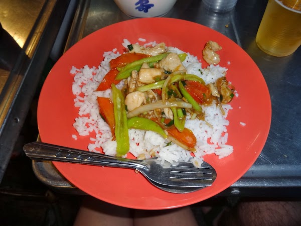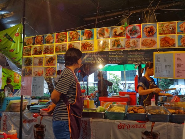 Powoli zaczyna się ściemniać, świątynie są już powoli zamykane, jedna nawet już o 16:00, tak więc całego kompleksu nie udaje się nam dokładnie zwiedzić. Niemniej myślę, że duch i zmysły zostają nasycone, czas więc pomyśleć o nakarmieniu ciała. Opuszczamy Wat Po i ruszamy w poszukiwaniu jakiejś loklanej knajpki na kolację. Niedaleko świątyni trafiamy na, można by powiedzieć, cały zespół tajskich ulicznych restauracji, w których jedzą przeważnie Tajowie. Nieśmiało wchodzimy do jendej z nich i studiujemy menu. Od razu podchodzi do nas obsługa i tłumaczy, co kryje się pod tajskimi robaczkami. Ceny wyglądają całkiem znośnie, jest nawet piwko, tak więc zostajemy. Ja zamawiam coś, co jest ryżem z kurczakiem i warzywami i kosztuje 50 THB. Piwo jest niestety drogie, 0.5 l kosztuje 120 THB, ale co tam, zasłużyliśmy:)