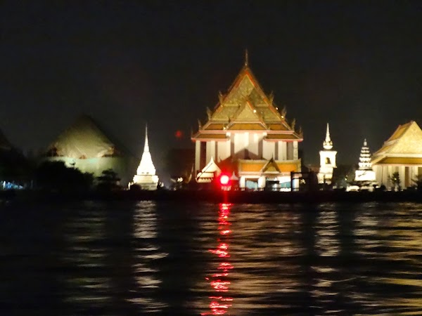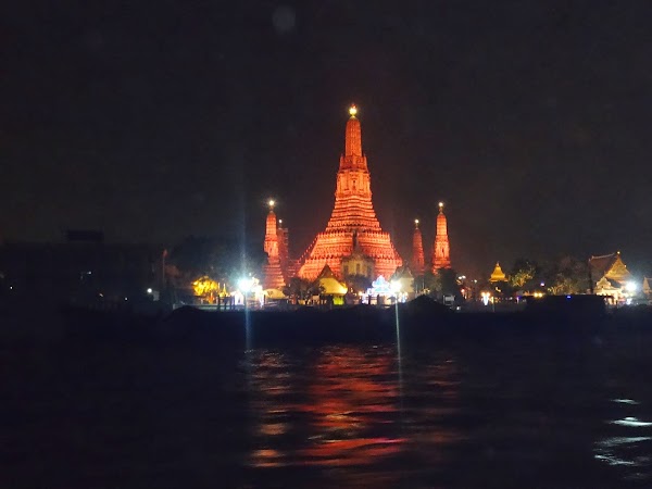 W końcu wsiadamy do tramwaju i płyniemy w kierunku naszego hostelu… Po drodze możemy podziwiać pięknie oświetlone Wat Arun i Kalayanamit.