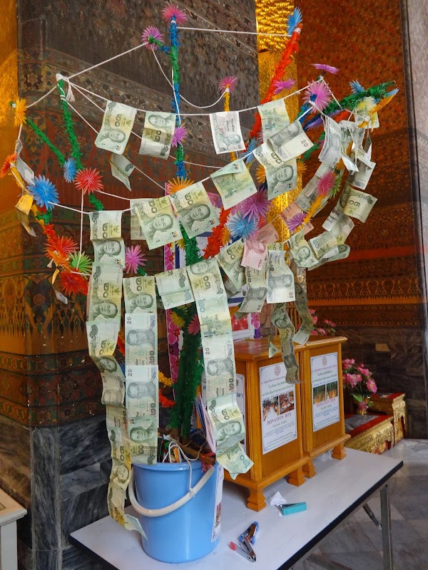 Wzdłuż wiharnu (budynku świątynnego) uwagę zwracają powoli przechadzający się Tajowie i naśladujący ich turyści. Wszyscy wrzucają do ustawionych w rzędzie 108 skarbonek po jednej monecie. Ma to zapewnić szczęśliwe życie. Monety brzęczą jakby niestrudzenie powtarzały swoją szczęśliwą mantrę. Stoją tu również znane już nam drzweka uginające się pod ogromną ilością banknotów.