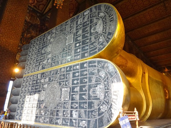 Kolejne miejsce, przy którym się zatrzymujemy to stopy. Perłowe ornamenty podeszew przedstawiają 108 symboli i stopni buddyjskiego oświecenia. To także jest bardzo popularny punkt fotograficzny. Można stąd uchwycić całego Buddę wraz z jego stopami.
