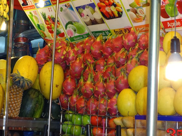 Do tego świeże soki i wielkie koktajle przyrządzane także ze świeżych owoców. Na końcu Rambuttri, tuż przy rondzie jest całkiem spory stragan z takimi pysznościami. Gdzie nie spojrzymy mango, pomarańcze, smocze owoce… i długa kolejka chętnych na owocowy napój. Koktajl owocowy kosztuje 30 THB, natomiast świeżo wyciskany sok 25 THB. To tutaj próbuję swojego pierwszego smoczego owocu (dragon fruit), zachęcona przez sympatycznego blondyna czekającego ze mną w kolejce. Owoc ten wygląda bajkowo, jego mocno różowa skórka obiecuje cudowną słodkość. Jednak uwaga, miąż wygląda zupełnie inaczej, jest biały z czarnymi malusieńkimi pesteczkami. Funduję sobie duży koktajl właśnie z tego owocu i jakie jest moje zdziwienie, gdy biorę pierwszego łyka. Wcale nie przypomina słodkiego mango, smakuje dziwnie, jak mak! To zapewne przez te małe pestki, gdyż jak się potem okaże, w kawałku smak jest już bardziej owocowy.