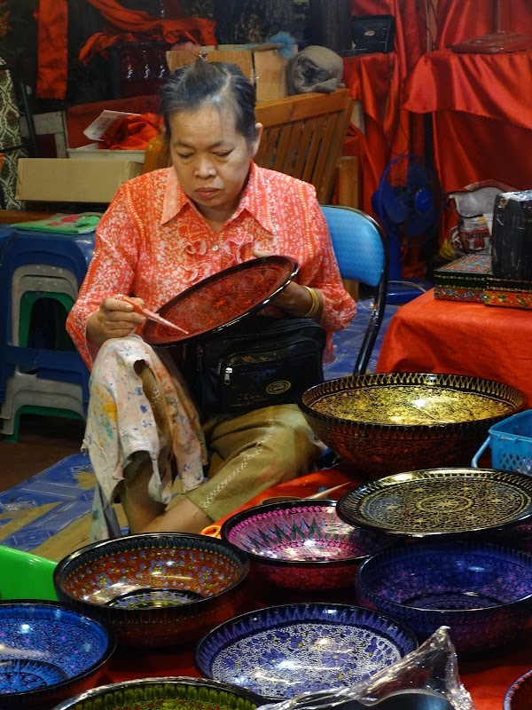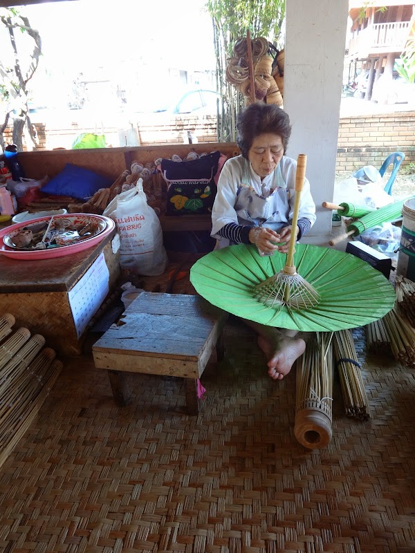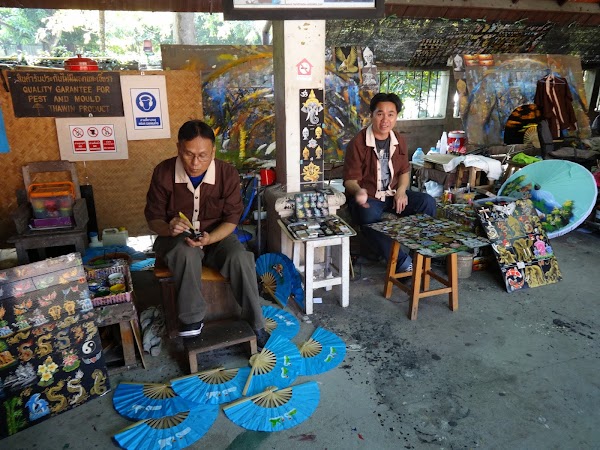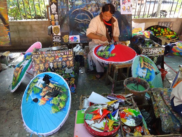 Po odwiedzeniu kilku świątyń w Chiang Mai postanawiamy wyjechać nieco poza miasto, by obejrzeć sławne w tym regionie tajskie rzemiosło. Podobno można tu obserwować tajskich artystów bezpośrednio przy pracy, czyli na własne oczy zobaczyć, jak powstaje piękne rękodzieło północnej Tajlandii. Warsztaty znajdują się w wiosce Borsang oddalonej o 10 km na północ od Chiang Mai. Można zobaczyć tutaj misterne wyroby z drewna, laki, srebra czy jedwabiu. Najsłynniejszym produktem są niewątpliwie przepiękne kolorowe ręcznie wykonywane parasolki i właśnie ten warsztat najbardziej mnie ciekawi, tym bardziej że parasolki można od razu zakupić na miejscu. Bardzo piękna pamiątka, prawda?