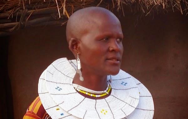 Jako że w drodze na safari dość szczegółowo wypytujemy Josepha o masajskie zwyczaje, proponuje nam wizytę w ichniej wiosce. Oczywiście od razu się zgadzamy i zgodnie z umową po zakończonym safari udajemy się w masajską gościnę. Wstęp do wioski kosztuje 20$ od całej grupy, więc nie jest to majątek. Po opuszczeniu jeepa wita nas grupa uśmiechniętych masajskich kobiet ubranych w kolorowe tuniki z białymi naszyjnikami na szyi. Zatrzymujemy się przy czymś w rodzaju straganu, na którym wisi mnóstwo masajskich wyrobów z koralików.