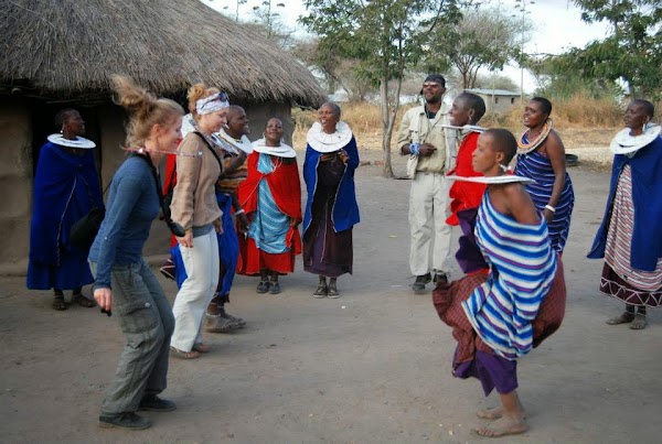 Kiedy opuszczamy chatkę, panie Masajki ustawiają się w rządku i zaczynają intonować jakąś piosenkę. Po chwili rozbrzmiewają głośne śpiewy i zaczynają się tańce. Nim się spostrzeżemy zostajemy wciągnięci w sam środek masajskiej imprezy. Masajski taniec to nic innego jak podskoki naprzeciwko siebie, trzeba złapać rytm, a potem to już coś w rodzaju transu.