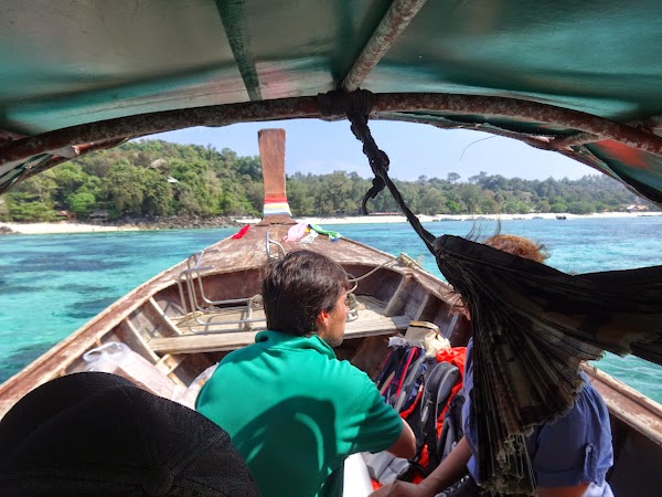 Po dotarciu promem na Phi Phi, wysiadamy na przystani i rozglądamy się za panem z napisem naszego hotelu. Jest! Dostrzegamy także zacumowaną łódkę Viking Natures Resort. Transport to hotelu jest darmowy, nie byliśmy jednak pewni, bo na moje maile nikt nie odpowiedział. Pan mówi, że jeszcze chwilę musimy poczekać, żeby wszyscy goście się zebrali. Ja w międzyczasie biegnę po wodę, bo upał jest niemiłosierny. W końcu wsiadamy do łódki i płyniemy w stronę Vikinga. Kolor wody jest niesamowity!