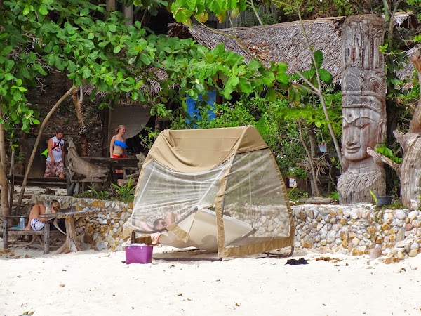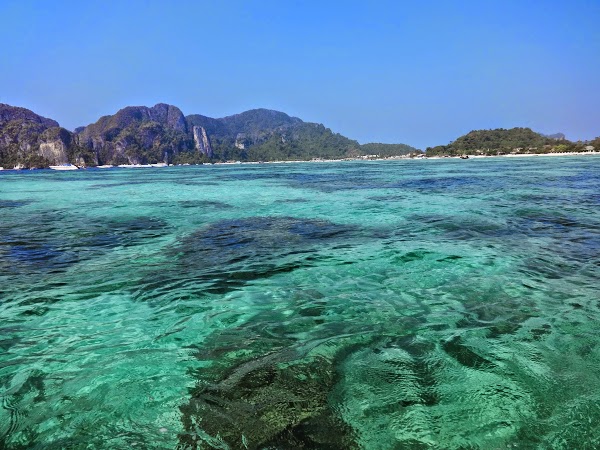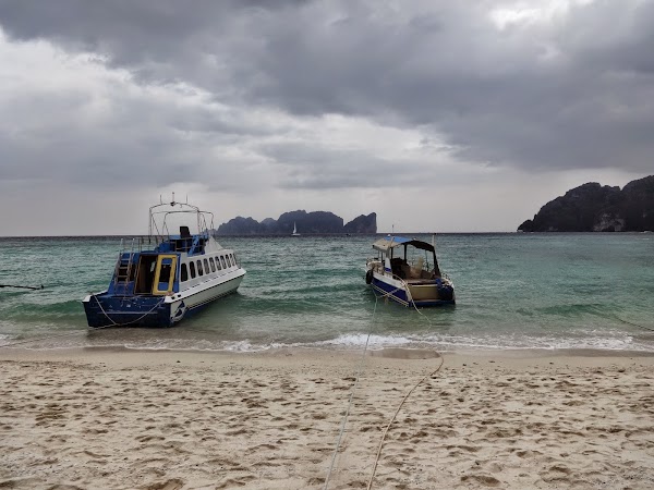 Są dwie i to prywatne. Jedna jest bliżej naszego bungalowa, druga przy samej recepcji, do tej idzie się około 5-10 minut piechotą. Obie w ogóle nie zatłoczone, co wydaje się dziwne przy pełnym obłożeniu hotelu. Ta bliżej naszego zakwaterowania jest spokojniejsza, wydawać by się mogło, że ładniejsza, jednak nam bardziej do gustu przypada ta przy recepcji. Mimo zacumowanych łódek, miejsca wcale nie jest mało. Woda jest czysta, a z plaży w nieskończoność można podziwiać Phi Phi Leh, po której biegał DiCaprio w słynnym filmie “Niebiańska plaża”. Bliskość baru to też zaleta, owocowe koktajle tutaj serwowane są przepyszne, szczególnie bananowy. Zamówienie takiego to chwila, a potem ktoś z obsługi dostarczy nam go na plażę.