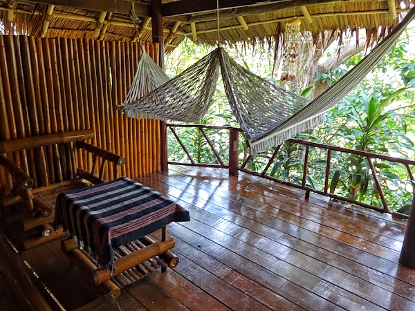 Najpierw idziemy tzw. główną alejką, która też prawdopodobnie prowadzi do miasteczka, mijamy druga plażę i wchodzimy nieco wyżej. Jesteśmy na miejscu, nasz domek ma numer R16. Michał pierwszy wchodzi do środka i zaprasza mnie z szerokim uśmiechem, naprawdę jest ładnie! Domek jest czysty i urządzony bardzo klimatycznie, może nie ma w nim super dużo miejsca, jednak na pewno jest go wystarczająco. W środku znajduje się podwójne łóżko z moskitierą, wiatrak, szafka, lustro i mała zaopatrzona lodówka. Bungalow jest oczywiście z łazienką, a także z małym tarasem, gdzie stoi ława i mały stoli oraz zawieszony jest hamak. Na łóżku przy podgłówkach witają nas rozsypane kwiaty! Po odświeżeniu się ruszamy na rozpoznanie okolicy.