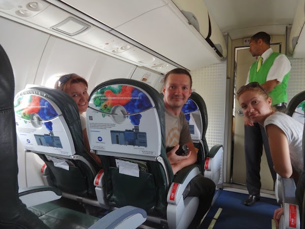 Po opuszczeniu samolotu przez poprzednich pasażerów oraz zatankowaniu, zostajemy zaproszeni na pokład. Miejsca mamy z przodu samolotu, czyli nie tam, gdzie zazwyczaj wybieram. Samolot jest w całkiem dobrym stanie, nie widać śladów długoletniego użytkowania, rzekłabym, że jeden z nowszych modeli. Personal pokładowy ubrany jest w zielono-żółte uniformy, a więc w kolory, w jakie malowana jest maszyna. Startujemy tylko pół godziny po czasie.